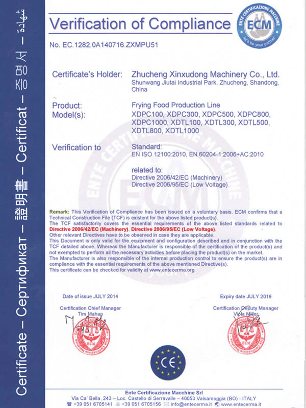 • شهادة CE لخط إنتاج الأطعمة المقلية