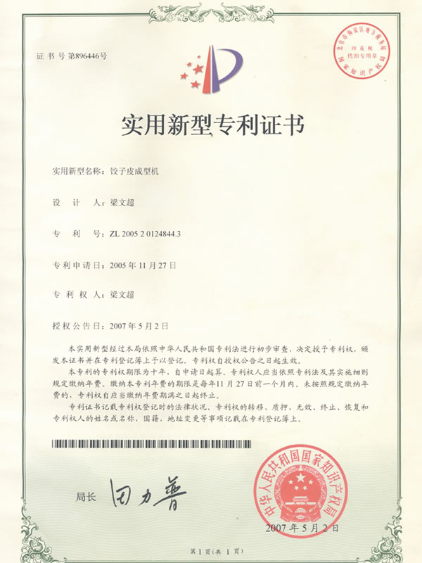 • شهادة براءة لآلة تشكيل ألواح عجينة الزلابية