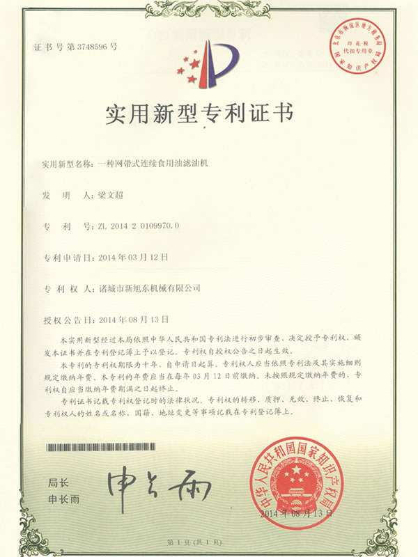 • شهادة براءة لمصفاة الزيت بحزام شبكة مستمر