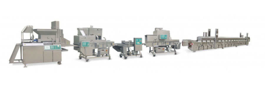 خط إنتاج قطع دجاج كنتاكي يقوم تلقائياً بالتشكيل، وضع الطحين، التغميس في الخلطة، والخبز على اللحم، الدجاج، الأسماك والخضروات.